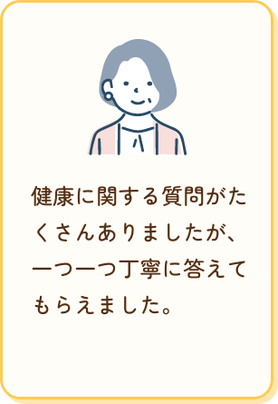 健康に関する質問がたくさんありましたが、一つ一つ丁寧に答えてもらえました。