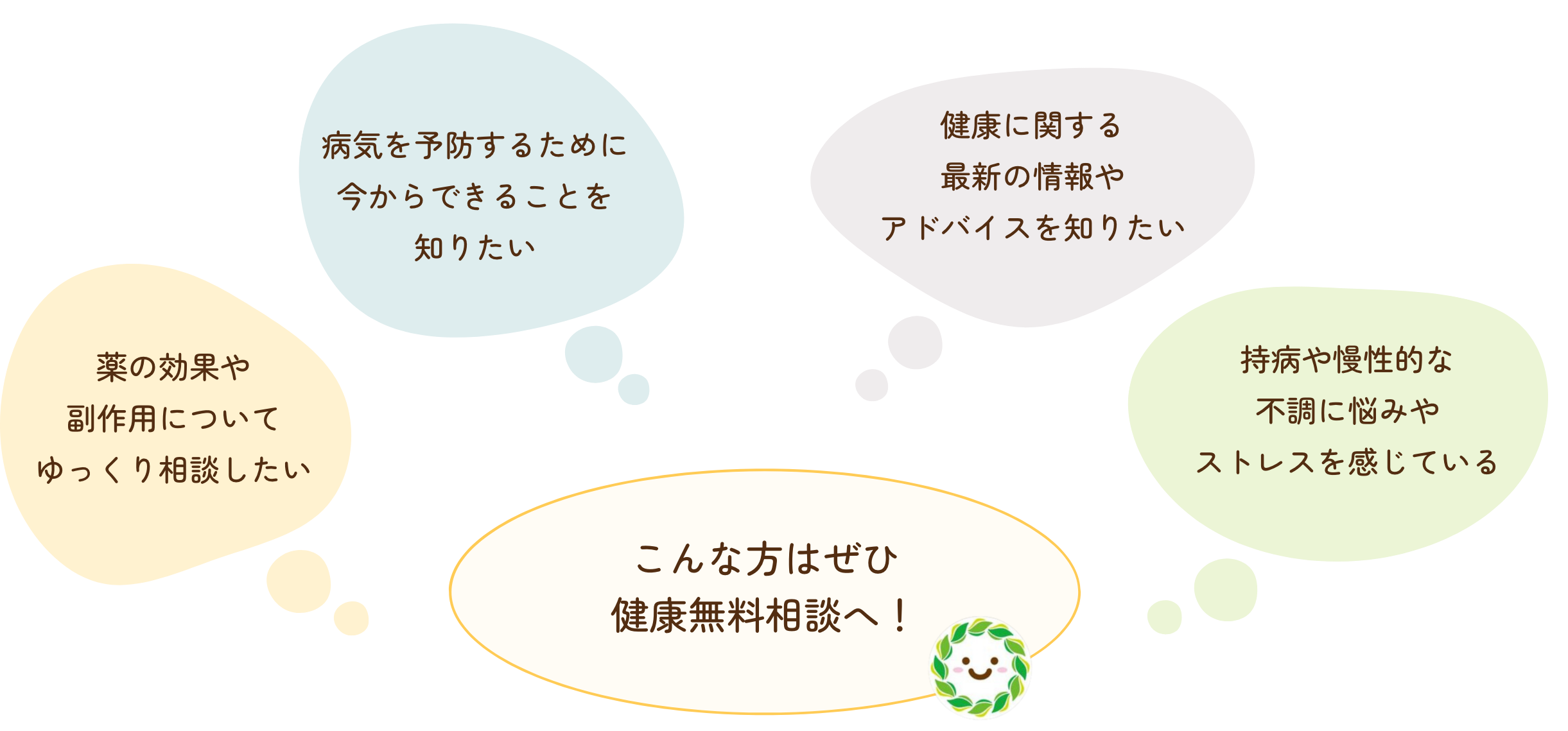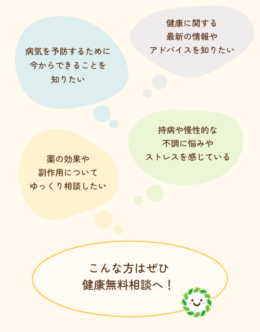 A. 病気や薬に関することから、生活習慣や体調の悩みまで、幅広くご相談を受け付けております。