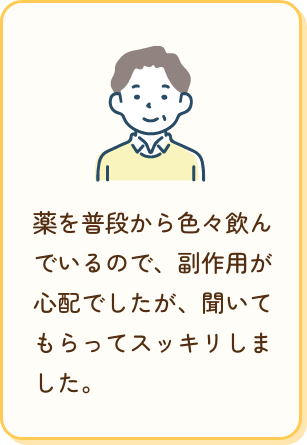 薬を普段から色々飲んでいるので、副作用が心配でしたが、聞いてもらってスッキリしました。