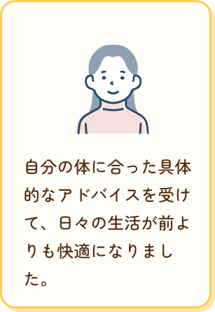 自分の体に合った具体的なアドバイスを受けて、日々の生活が前よりも快適になりました。