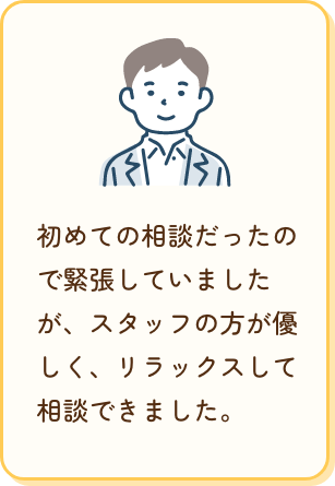 初めての相談だったので緊張していましたが、スタッフの方が優しく、リラックスして相談できました。