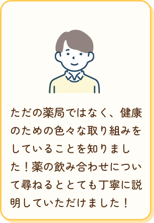 健康のための色々な取り組みをしている薬局だと知りました!薬の飲み合わせについて尋ねるととても丁寧に説明していただけました!